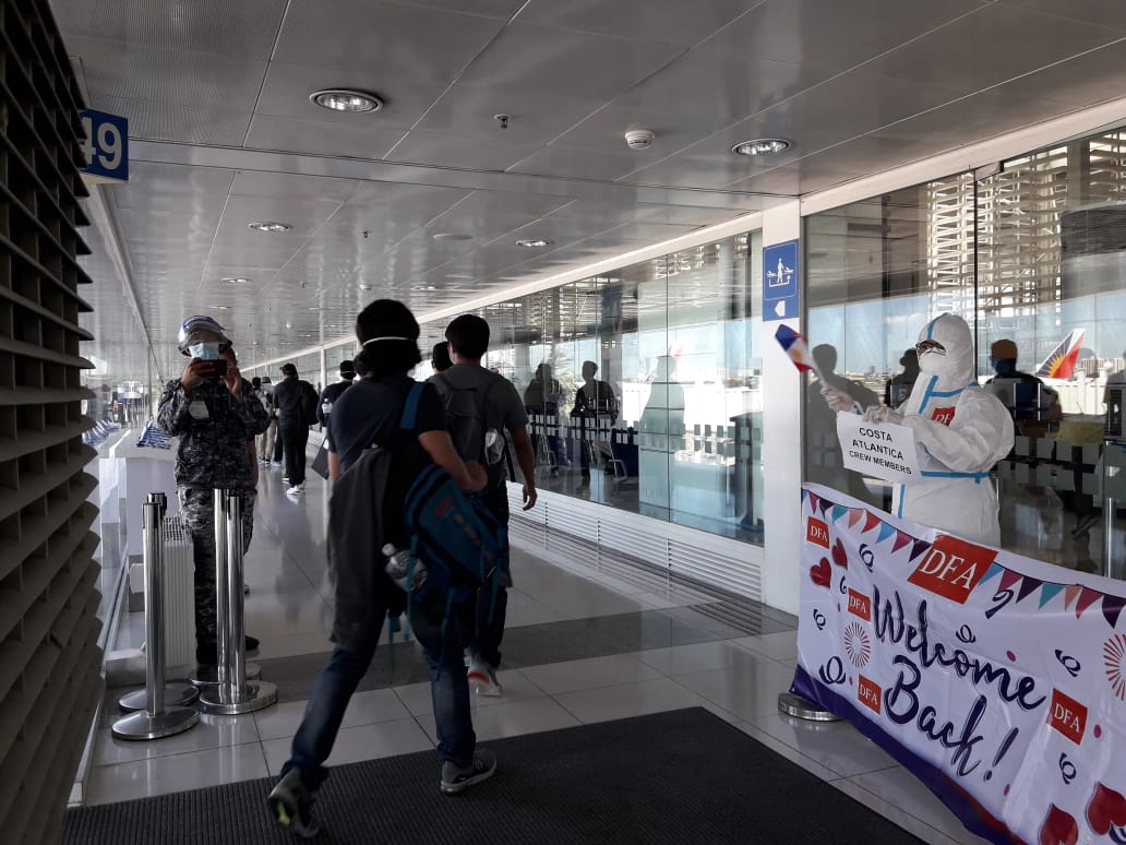 The Department of Foreign Affairs said the repatriates who worked aboard Costa Atlantica cruise ship arrived at the NAIA Terminal 2, “with permission from the Inter-Agency Task Force for the Management of Emerging Infectious Diseases (IATF) Sub-Task Group for the Repatriation of OFWs.”