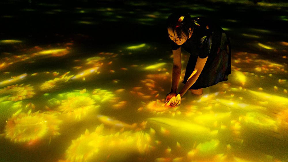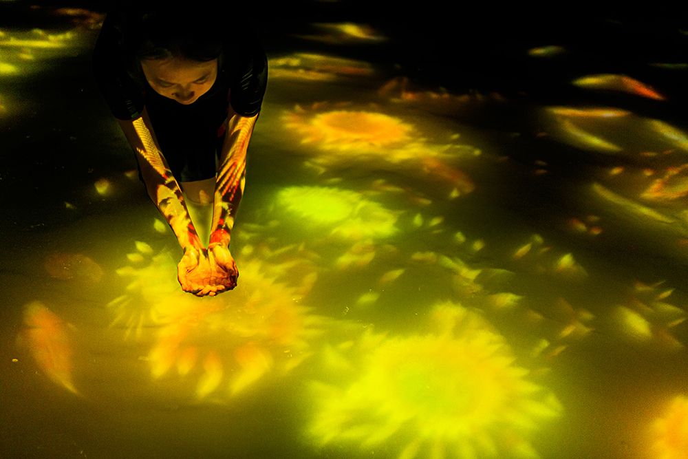 In the digital art piece, “Drawing on the Water Surface Created by the Dance of Koi and People - Infinity,” when a carp that swims on the surface of the water collides with people, it will turn into a sunflower and scatters.