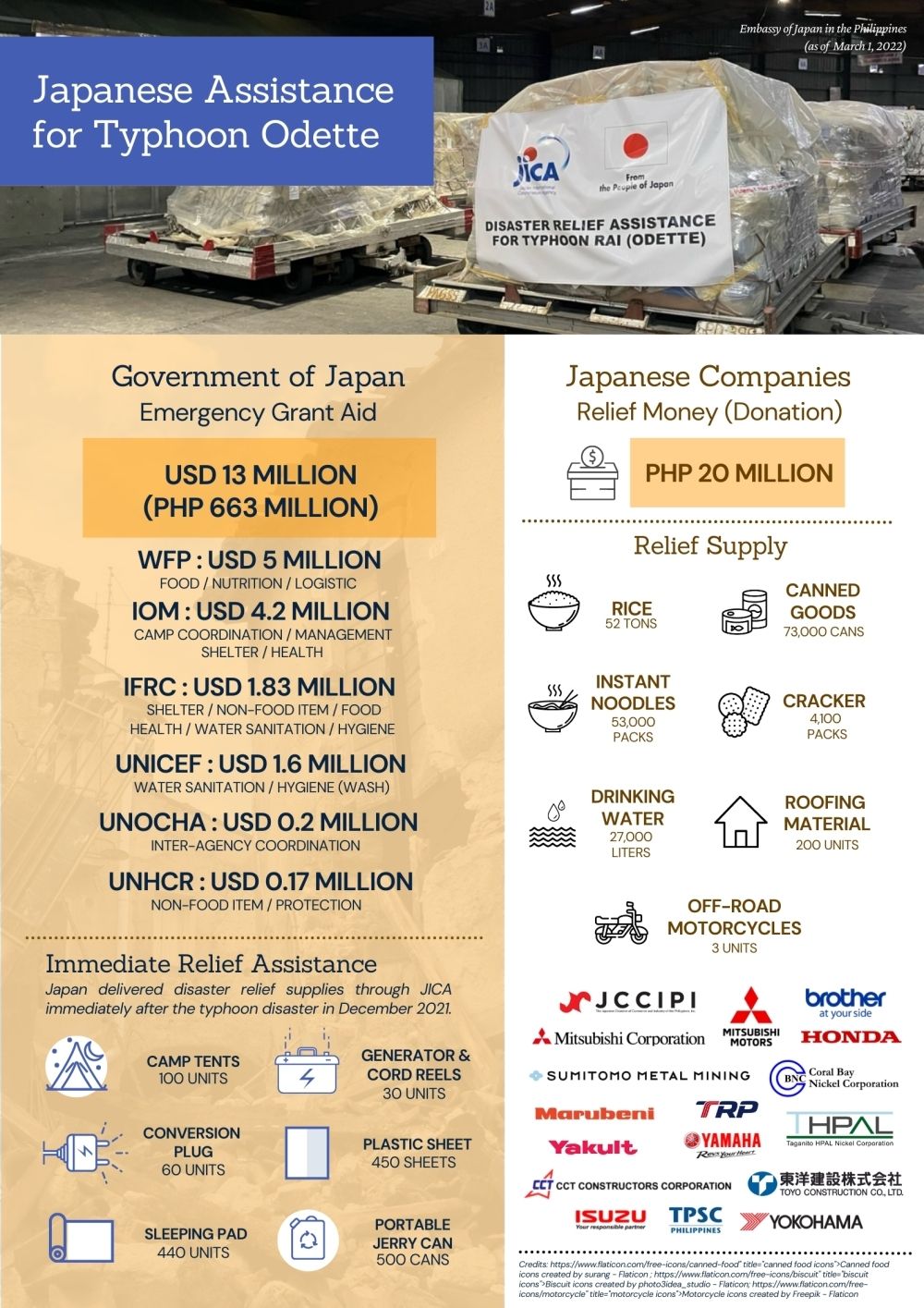 According to the Japan Embassy, the Japanese government provided an Emergency Grant Aid of USD 13 million (approximately PHP 663 million) to multiple international organizations – the WFP, UNICEF, IFRC, UNHCR, UNOCHA, and IOM – for the implementation of humanitarian assistance for survivors in central and southern parts of the Philippines.