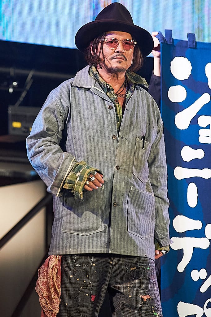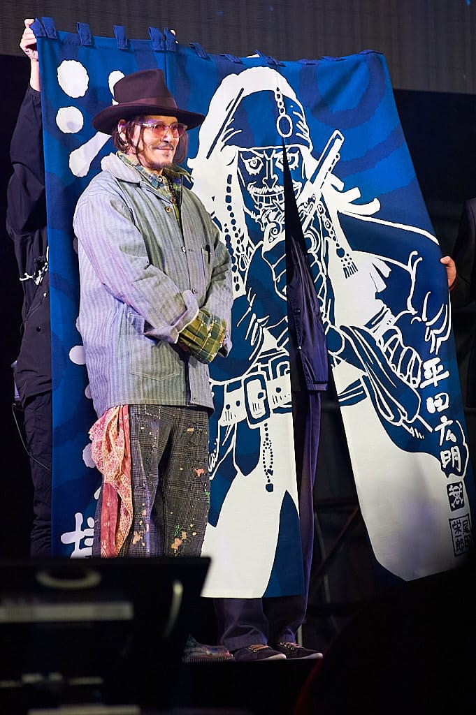 Johnny Depp receives a custom pirate-themed curtain as an early Christmas gift at Tokyo Comic Con 2025 on Dec. 7, following a Japanese tradition of giving stage actors such tokens.