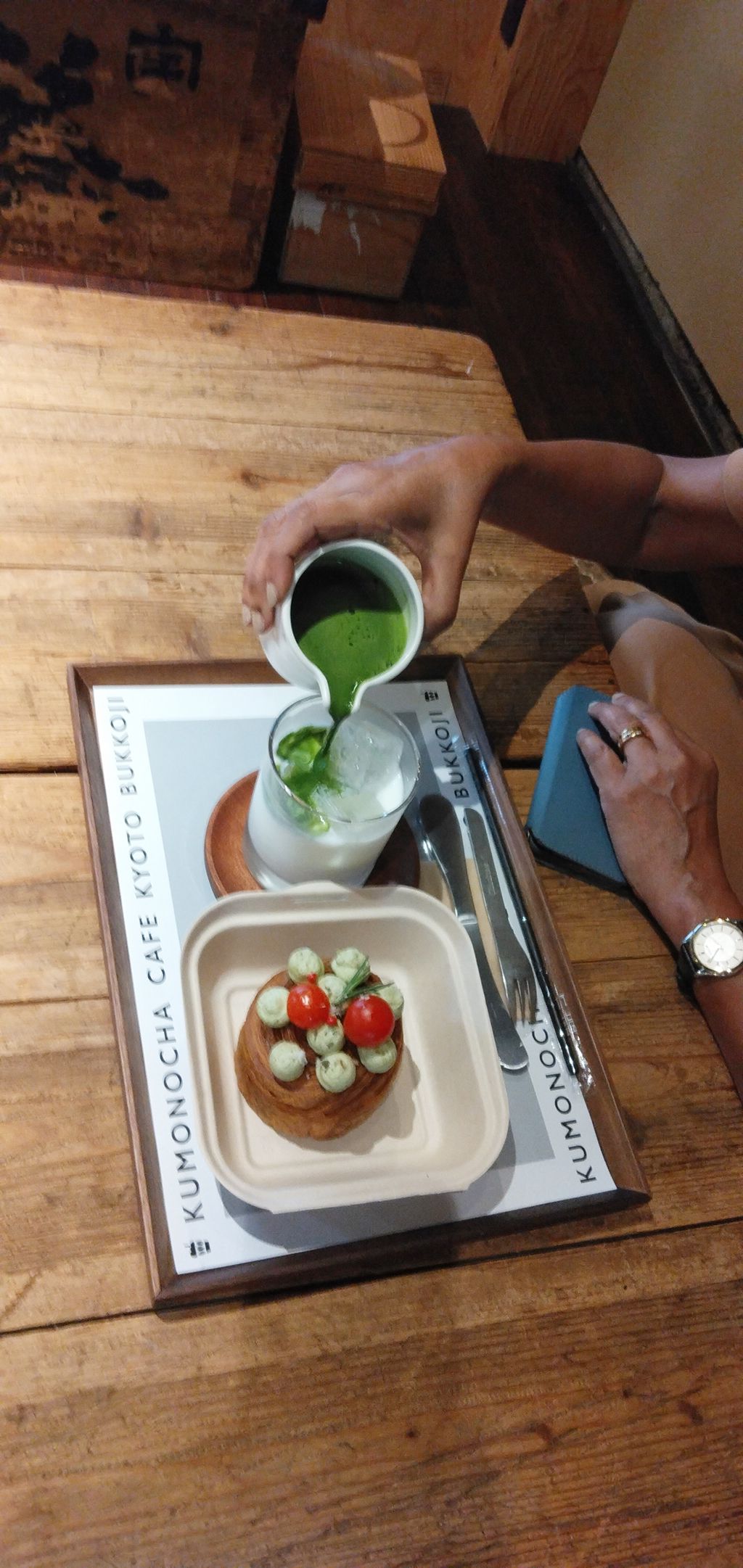 Later, I took a break at one of Kyoto’s beautiful cafes. The ancient city of 1.1 million people restricts high buildings, so most cafes and restaurants are located in old wooden houses containing heavy wooden beams and low ceilings. Matcha–powdered green tea–now popular around the world—actually originated in Kyoto. My cold matcha latte served at the Kumonocha cafe contained a glass of hot, thick matcha that I mixed with iced milk. Sipping the drink while seated on a wooden bench, I savored the perfect blend of bitter and sweet, a Japanese aesthetic highlighting the contrasts in our lives. Nice!